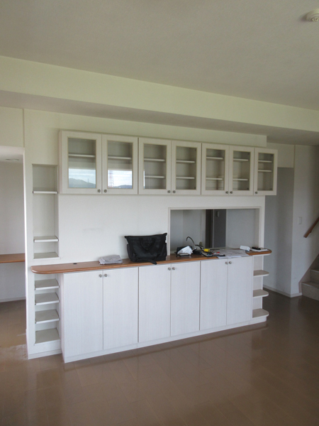 背後には、お揃いの収納を設置しました。