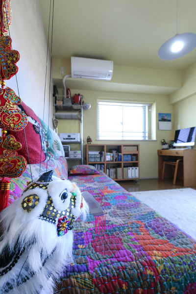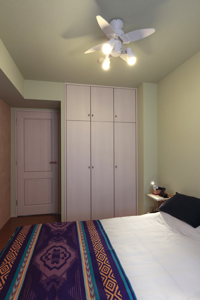グリーンの壁とエスニックなインテリアがすてきな寝室。海外では、鮮やかな色のクロスがよく使われているそうですが、やさしいグリーンが、落ち着いた空間となっています。