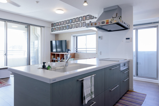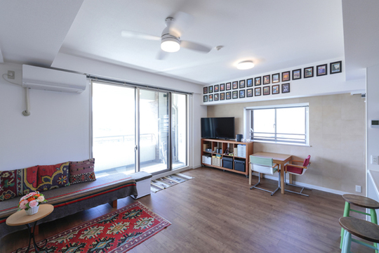 抜群の眺望のあるお部屋なので、キッチンもオープンにし、明るいLDKになるように改装しました。お部屋の魅力的な間取りを生かし、世界のカラフルな思い出の品々が映えるように、内装はシンプルにまとめました。入居後、お部屋がご夫妻のすてきなインテリアセンスで彩られ、居心地のよい素敵なお住まいに更にグレードアップして驚きました。新しくなったお住まいでお客様が暮らしを楽しまれていることが嬉しいです。