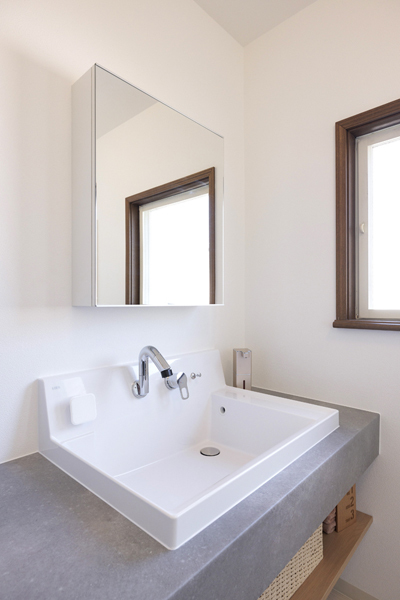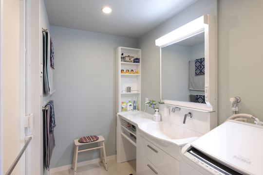 洗面化粧台の位置を90度移動し、洗面所が広く使いやすくなりました。収納カウンター付きなので、洗面台の上にゆとりスペースがあります。海外生活の長かったお客様が各国で集められた雑貨が空間を彩っています。