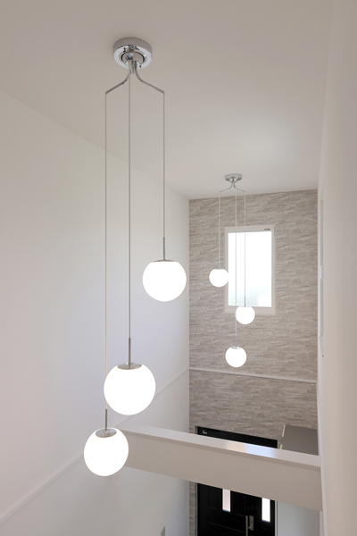 2階から見た玄関の吹き抜け。クロスは明るい白と高級感のある石目のアクセントクロスを貼りました。美しいペンダントライトが灯るとホテルのロビーのようです。窓は断熱窓にしました。