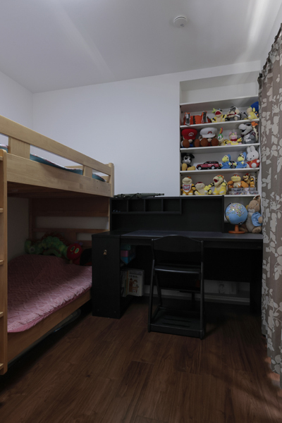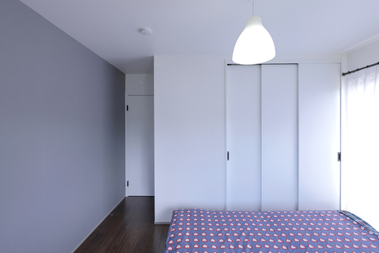 真っ白な建具にグレーのアクセントクロスが効いて、コントラストのあるおしゃれなお部屋となっています。収納は間口を広げ、ドアを交換しました。