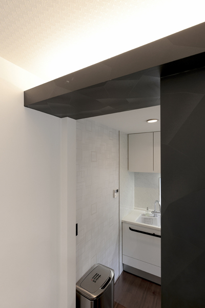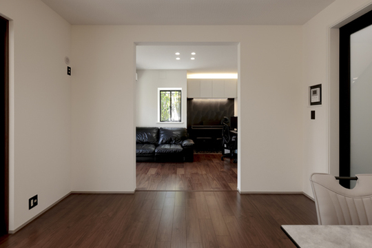 天井近くまで高いハイドアを入ると、ホテルのラウンジのように落ち着いたリビングが広がります。間接照明に美しいクロスが映えます。