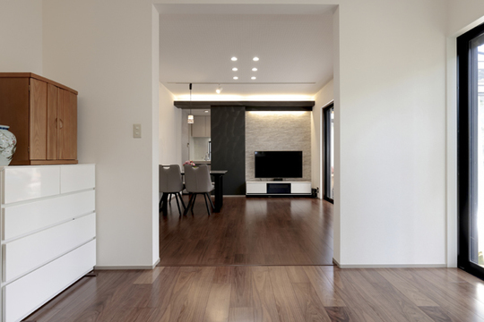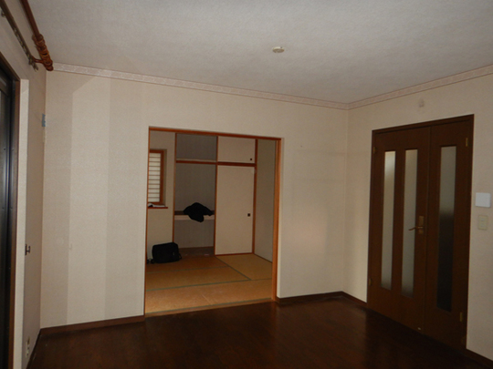 キッチン側からリビングを見たところ。以前は、奥は和室でした。