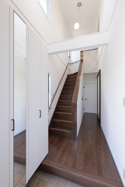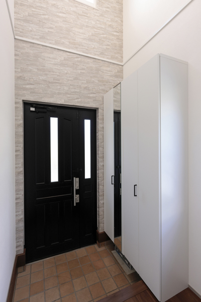 2階まで吹き抜けている明るい玄関。白い大容量の玄関収納を設置しました。