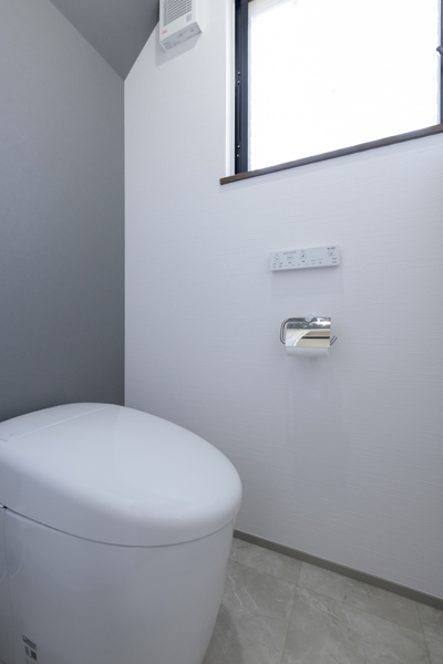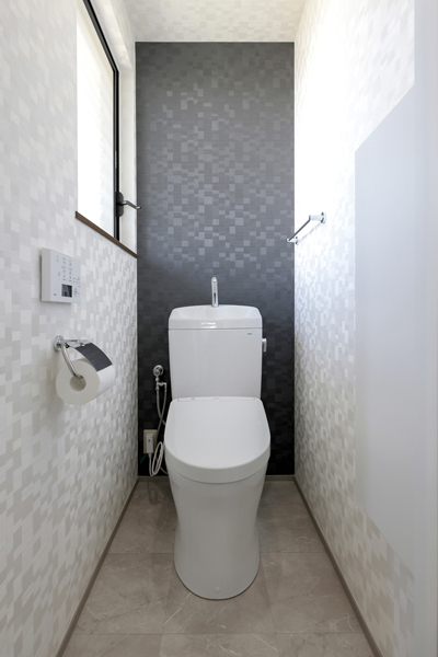 1階のトイレのカラーはモノトーンでまとめました。タンクレストイレで、すっきりとした空間になっています。