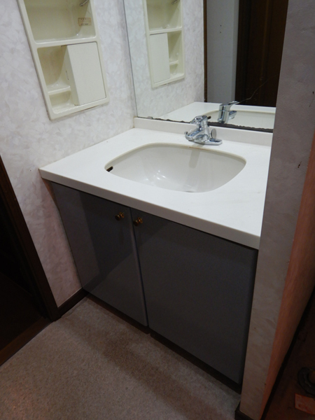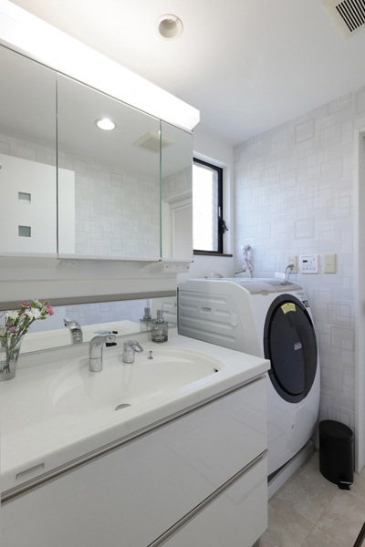 白を基調にまとめ、立体感のあるクロスがゴージャスな印象です。洗面化粧台は、広く、収納が充実しています。