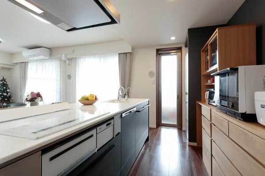 仕切り壁がなくなり、明るいキッチンになりました。リビング越しに深大寺の森が見渡せます。また子ども達の様子もよく見えて安心です。