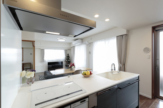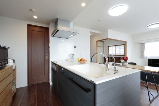 眺望がよく、晴れた日には遠くまで見晴らせる角部屋のLDKがよさを生かすために、キッチンの向きを壁向きからリビング方向に位置を変えました。このことにより、家事をしながらも、ご家族と交流ができ、また明るい眺めを楽しめるようになりました。キッチンにはタッチ水栓を採用するなど、お掃除しやすく、清潔に備品を使える配慮もされています。キッチン全体を、モノトーンを基調としたシックな色合いに統一し、飽きのこない落ち着いたインテリアに仕上がりました。