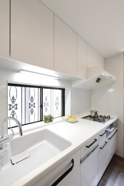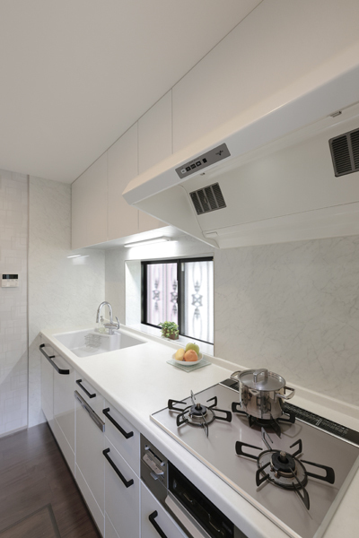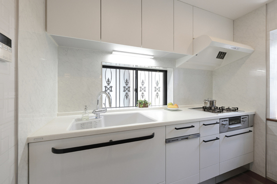 キッチンは、スタイリッシュなリビングに合わせ、すっきりとしたホワイトにリフォーム。換気扇も吸引力のあるものになりました(キッチン トクラスベリー)