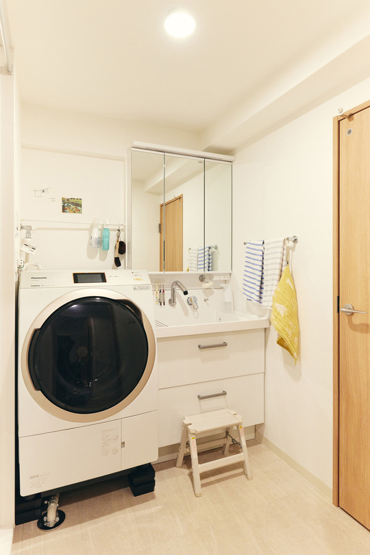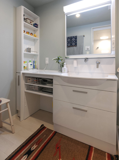 収納たっぷりの洗面化粧台です。縁取りがブラックベースのLIXILの洗面化粧台は、ホテルにいるようなラグジュアリーな空間を作り出しています。洗面台のライトは鏡の下に手をかざすだけでON OFFできます。洗面台のカラーに合わせて、天井に黒いクロスを貼り、アクセントカラーとしました。