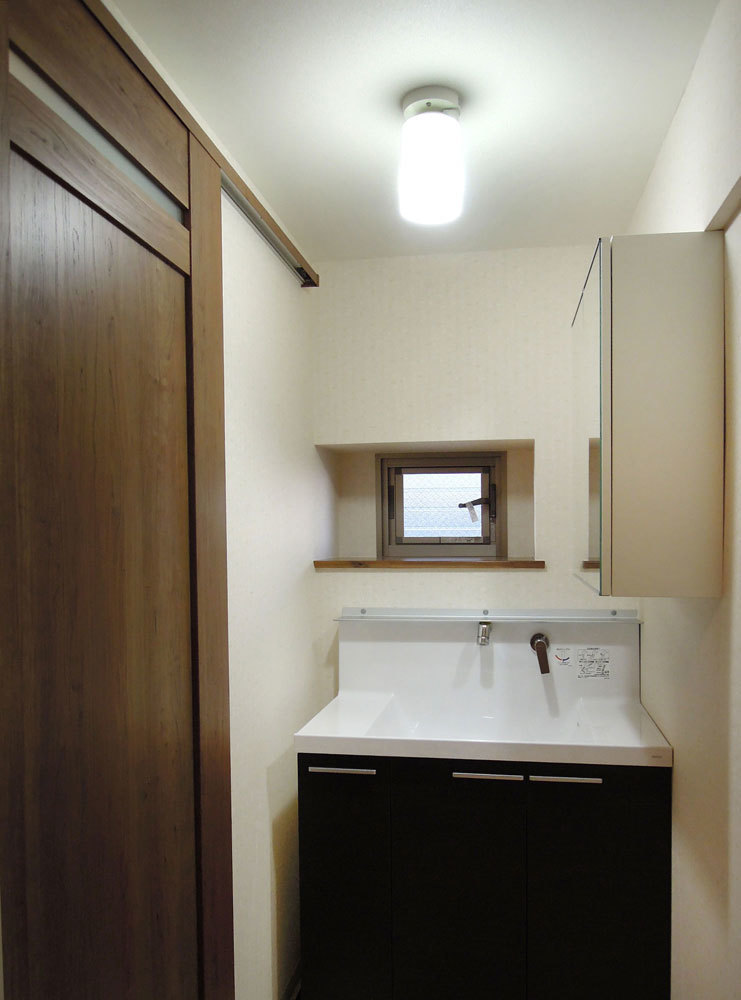 | 工事内容 | 解体、搬出処分、洗面化粧台組立、取付け、水道工事、壁収納造作、壁クロス・床クッションフロア張替え |