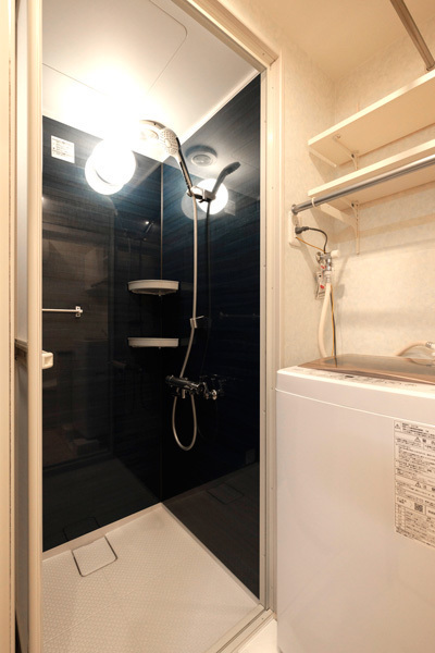 セカンドハウスなので、浴槽はつけずに、シャワー室を設置しました。面積と設備費の節約にもなっています。青いパネルがホテルに来たような高級感があります。