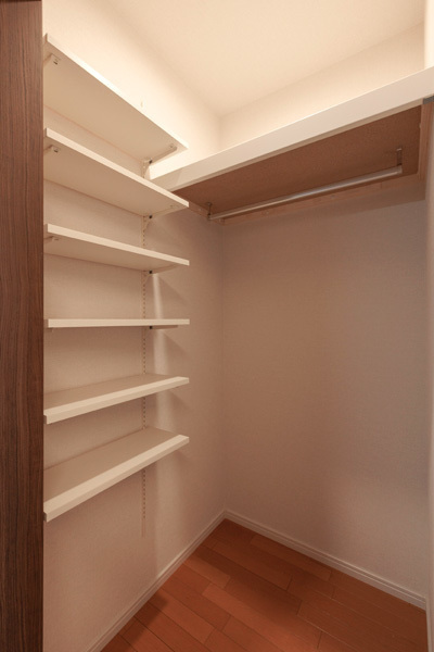 廊下側から入れるウォークインクローゼットを作りました。可動棚とパイプスペースで取り出しやすい収納ができます。ご自宅で普段使わないものなど整理してしまえます。