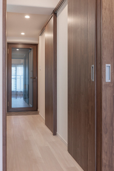 木目の引戸をしめると、すっきりとした廊下になります。