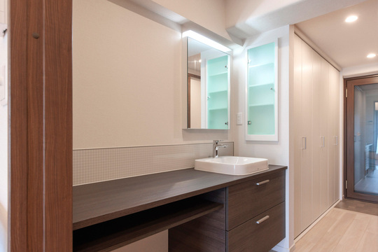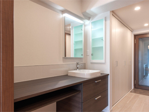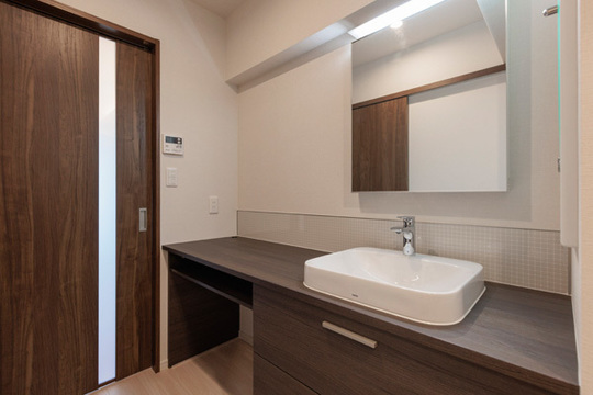 このお住まいには、キッチンは設置せずに、家具調のカウンター付き洗面化粧台「TOTOドレーナ」を廊下の一角につけました。ベッセル式洗面台がおしゃれです。木目なので、廊下にあってもインテリアの一部となって美しく見えます。広いカウンターに椅子を置けばパソコンワークもできます。右手の壁に収納を付けました。