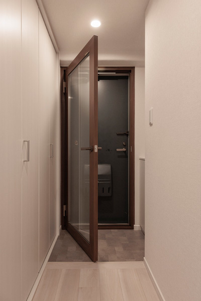 玄関ドアの内側に、壁を厚くしてもう一枚新しく断熱窓を設置しました。見た目にもおしゃれで、生活感がなくなり、寒さ対策にもなります。