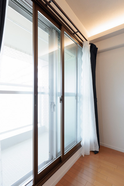 窓は内窓を設置し、防音、寒さ、暑さ対策に効果があります。高級感のあるカーテンレールをつけました。