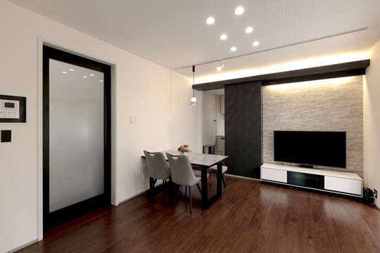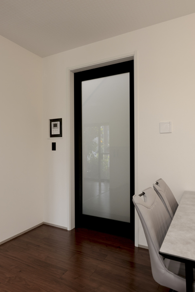 中古の戸建てのリフォームをされたお住まいです。リビングのドアは天井近くまで高い特注のハイドアの引戸を設置しました。高級感を醸し出しています。