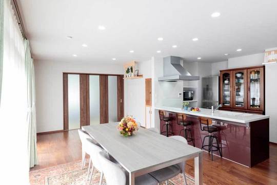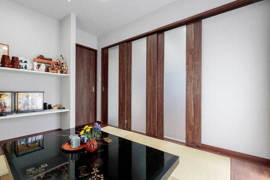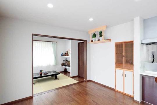築34年の賃貸物件付きのご自宅をリフォームをされたお住まいです。広いリビングと奥の和室を機能的に、美しく仕切ることのできる可動式ドアを付けました。半透明の窓なので、圧迫感がなく、両方の部屋の明るさが取り込めます。3枚のドアを全て開けると、大きく開き、リビングとつながります。