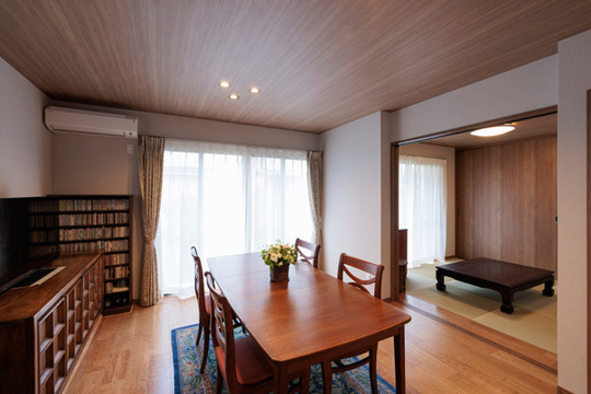 木目を基調としたリビングとつながる和室。洋風のリビングとインテリアがなじむように押入を襖ではなく木目の引戸にしました。