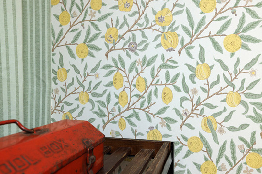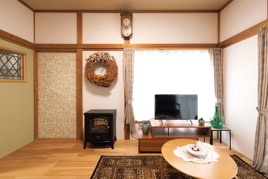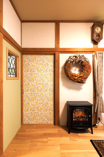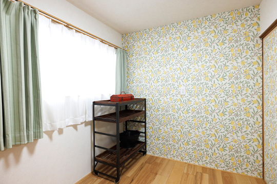 各部屋の壁の一部にアクセントクロスとして、ウイリアム・モリスのおしゃれなフルーツ柄を貼りました。ビンテージ感が一層アップし、華やかな彩りとなっています。