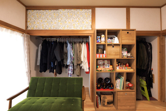 押入だったスペースは、あえて戸をなくし、衣類や収納品を取り出しやすくしました。パイプをつけたので、衣類がひと目でわかるように整理できます。