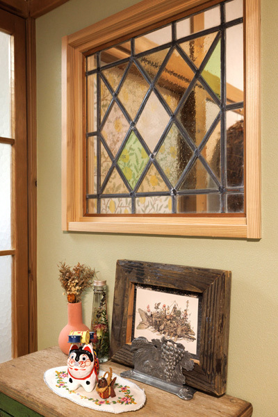 九州で出会いずっとしまってあった英国製の美しいステンドグラスを壁に枠を作りはめ込みました。お部屋にきれいな光を採り込みます。