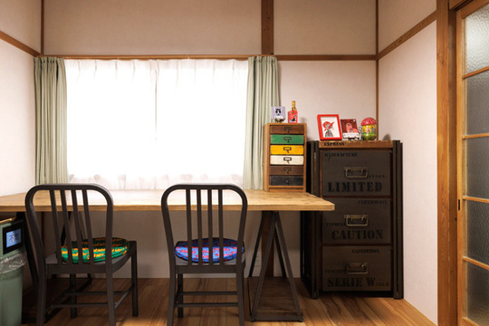 ご主人様の趣味は革細工。窓際のデスクでさまざまな小物を制作することが休日の楽しみだそうです。懐かしい型ガラスの窓やガラス戸は再利用しました。