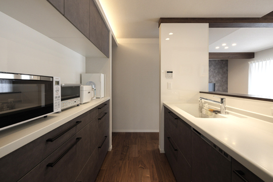 シックなリビングからの眺めと一体化するように、色合いを合わせました。キッチン部分はリビングより天井を1段下げ、デザインの工夫をしています。収納も十分な使いやすいキッチンになりました。リビングからは見えない大きなパントリーは、オープン棚なのでものが取り出しやすく使い勝手の良い収納となっています。
