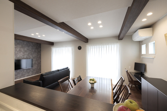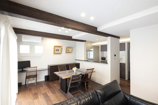 梁を活かしたモダンなLDK。梁と床の木目と壁の白に合わせたキッチンをコーディネートしました。