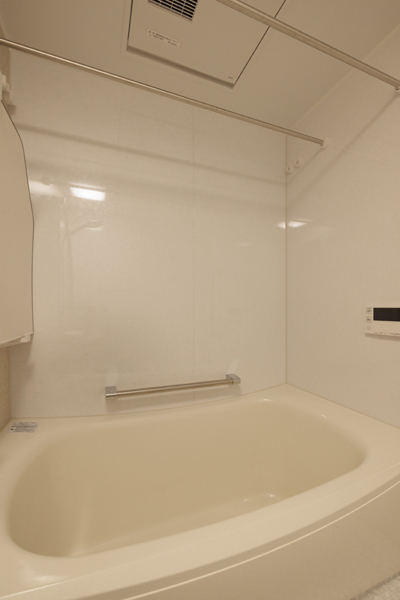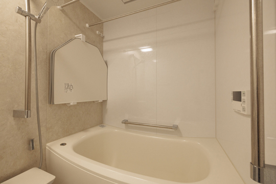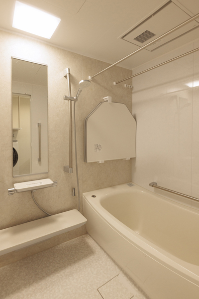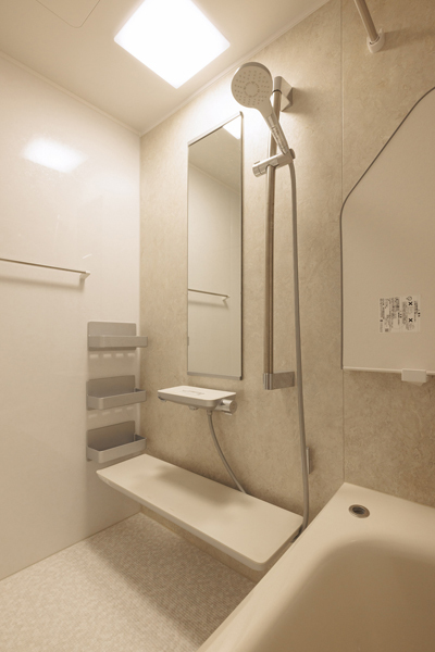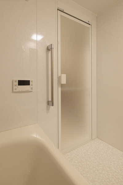 洗面化粧台と一緒にバスルームもリフォームしました。バスルームもオフホワイト系、洗面所とトータルコーディネートされています。