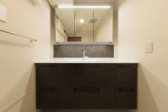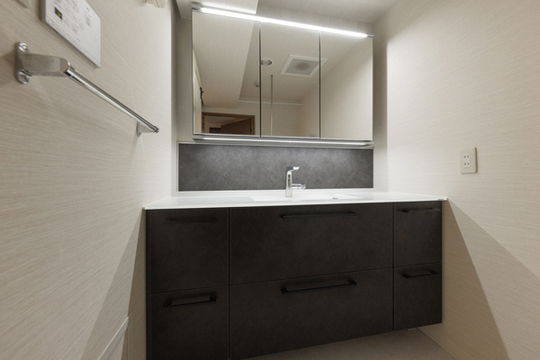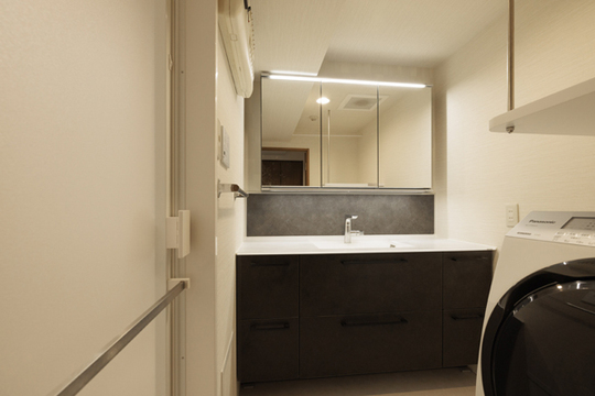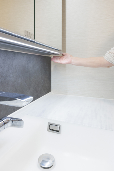 照明はタッチレス。手をかざすだけでON、OFFができるので、濡れた手でスイッチが汚れることがありません。水栓もタッチレス水栓です。バックパネルは、石のように見えるシックな材質感で、チャコールグレーがアクセントとなっています。