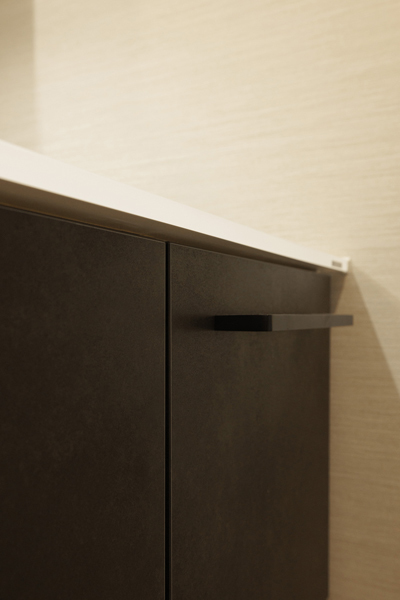 厚みのあるクリスタルカウンターは、側面から見ても美しく輝いて見えます。クロスもエンボスのある落ち着いたテクスチュアで、ホテルに来たような高級感があります。