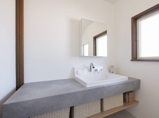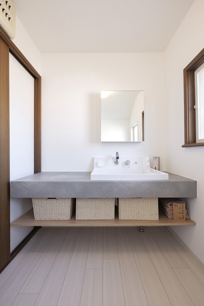 中古の二世帯住宅のリフォームです。上下階にそれぞれあった浴室のうち、二階の浴室はなくし、広い洗面所と家事スペースに改装しました。洗面台はシンプルなベッセル型。カウンターを広く伸ばし、下部には、収納カゴが置ける棚を作りました。向かい側は洗濯機置き場のあるランドリースペースとなっています。