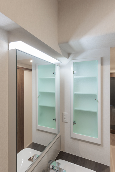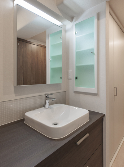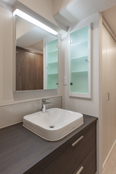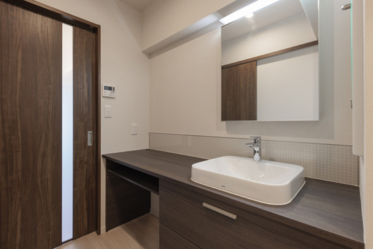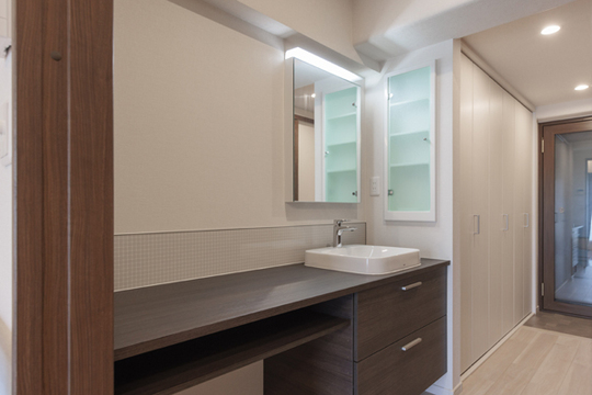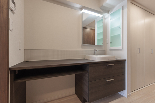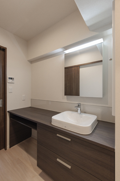 ご自宅のマンションの敷地内にセカンドハウスとして小さい間取りの住宅を購入されたお客様のおすまいです。こちらは、仕事や休息、収納のための住宅なので、キッチンは必要なく、廊下にあったキッチンのスペースに、カウンターの長いオフィスワークのデスクとしても使える洗面スペースを設けました。玄関からすぐに通るところなので、インテリア性が高いデザインにしました。