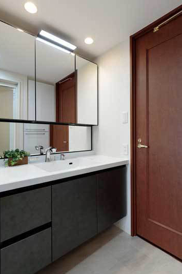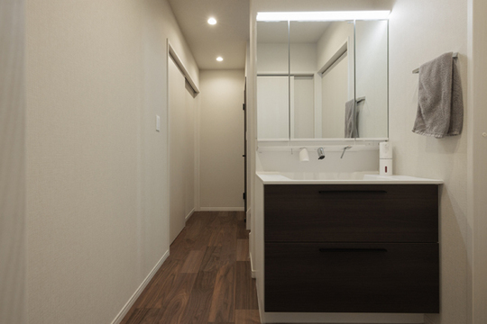 1階はリビングから入る引戸の奥に、二階への階段、浴室、トイレ、洗面スペース、納戸をまとめました。廊下面積を少なくし、廊下の一角に洗面台を設置しました。脱衣場と洗面所を分けることで、家族の入浴時間と洗面時間が重なってもそれぞれが使うことができます。脱衣場兼洗濯機置き場も広く使えるようになりました。