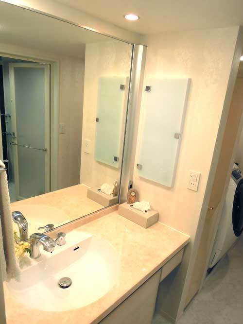 | 工事内容 | 解体、搬出処分、洗面化粧台組立、取付け、水道工事、壁クロス・床フローリング張替え |