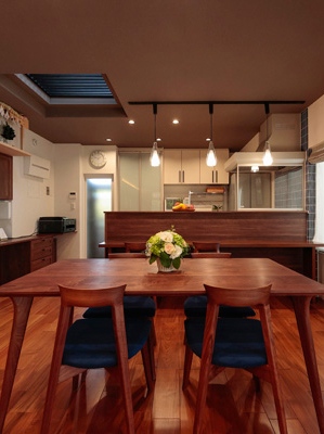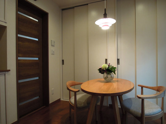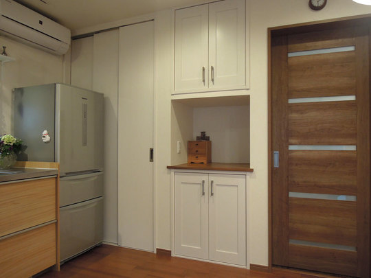築48年の木造住宅を全面リフォームしたお住まいです。リビングを広く取るために、キッチンの収納は、収納量を十分に確保しながら、面積を抑えてきっちりとはめ込みました。LDへの通路にある食器棚はキッチンからもLD側からも使いやすくなりました。