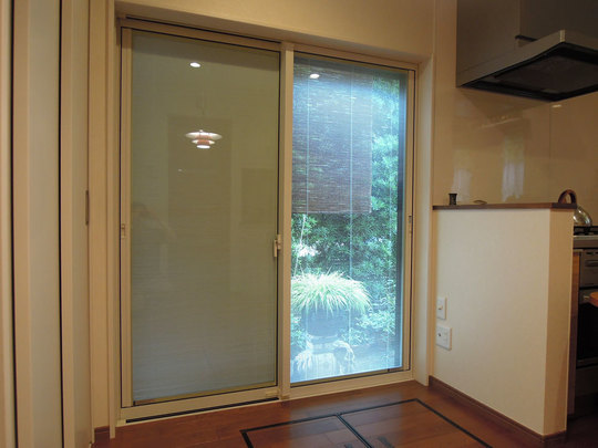 掃出し窓はブラインド入りの二重窓です。2枚のガラスの間にブラインドが入っているので、ほこりが溜まりません。ブラインドの開け閉めはボタンでできます。掃除が楽でスマートに目隠しができます。断熱、防音効果も十分です。