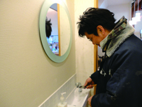 岩佐さんは、職歴20年以上のキッチンや浴室などの組み立て屋さんです。お父さんが店舗のディスプレーの仕事をしていたので、小さい頃から倉庫などで遊び、物作りが大好きでした。その延長か20代の頃には、バイクに熱中し、自分で整備もしてレースに出て「全日本選手権ノービズクラス」で表彰台に!ハードロックギターも得意。お兄さんはプロのミュージシャンとか。仕事は「きれいに,すばやく、丁寧に」がモットー。事前にしっかりイメージして施工します。今までの思い出の仕事は800万円もする高級バスの組み立て。緊張したそうですがうまく完成したそうです。